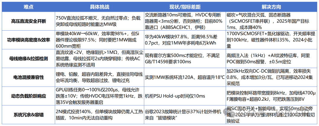 系統(tǒng)集成與解決方案:技術路線正快速演進,從傳統(tǒng)的240V/336VHVDC,到更高電壓的±400V,再到面向未來的800V及SST(固態(tài)變壓器)。SST被譽為能源路由器,能實現(xiàn)交直流自由轉換,并直接適配光伏、儲能等綠電接入,是未來的發(fā)展方向。
