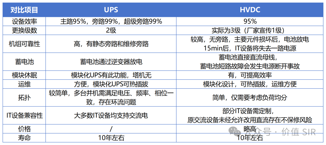 國內(nèi)的HVDC設計較海外方案對比:1)國內(nèi)用蓄電池備電,海外用BBU來短時備電。2)國內(nèi)并未引入超容,國內(nèi)當前由于使用的芯片性能相較于海外有一定差距,解決脈沖式功率問題的必要性不強。3)國內(nèi)HVDC模塊轉化的電壓較小,海外數(shù)據(jù)為800Vdc,國內(nèi)為240/336Vdc。4)國內(nèi)的HVDC系統(tǒng)后面,還需配一個列頭柜,需要占用一個IT機柜的位置,海外直接融合PDU到了Sidecar里面。