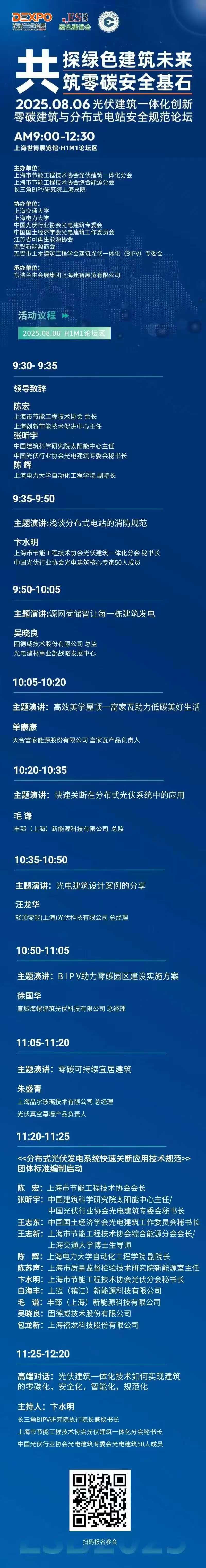 論壇由上海市節(jié)能工程技術(shù)協(xié)會光伏建筑一體化分會等主辦,東浩蘭生會展集團上海建智展覽有限公司承辦,上海交通大學(xué)等協(xié)辦,搭建權(quán)威交流平臺。議程豐富,9:30 開場后,上海市節(jié)能工程技術(shù)協(xié)會會長陳宏等領(lǐng)導(dǎo)將致辭。后續(xù),行業(yè)專家圍繞分布式電站消防規(guī)范、源網(wǎng)荷儲讓建筑發(fā)電等主題演講,還將啟動《分布式光伏發(fā)電系統(tǒng)快速關(guān)斷應(yīng)用技術(shù)規(guī)范》團體標準編制,最后開展 “光伏建筑一體化技術(shù)如何實現(xiàn)建筑零碳化、安全化、智能化、規(guī)范化” 高端對話。